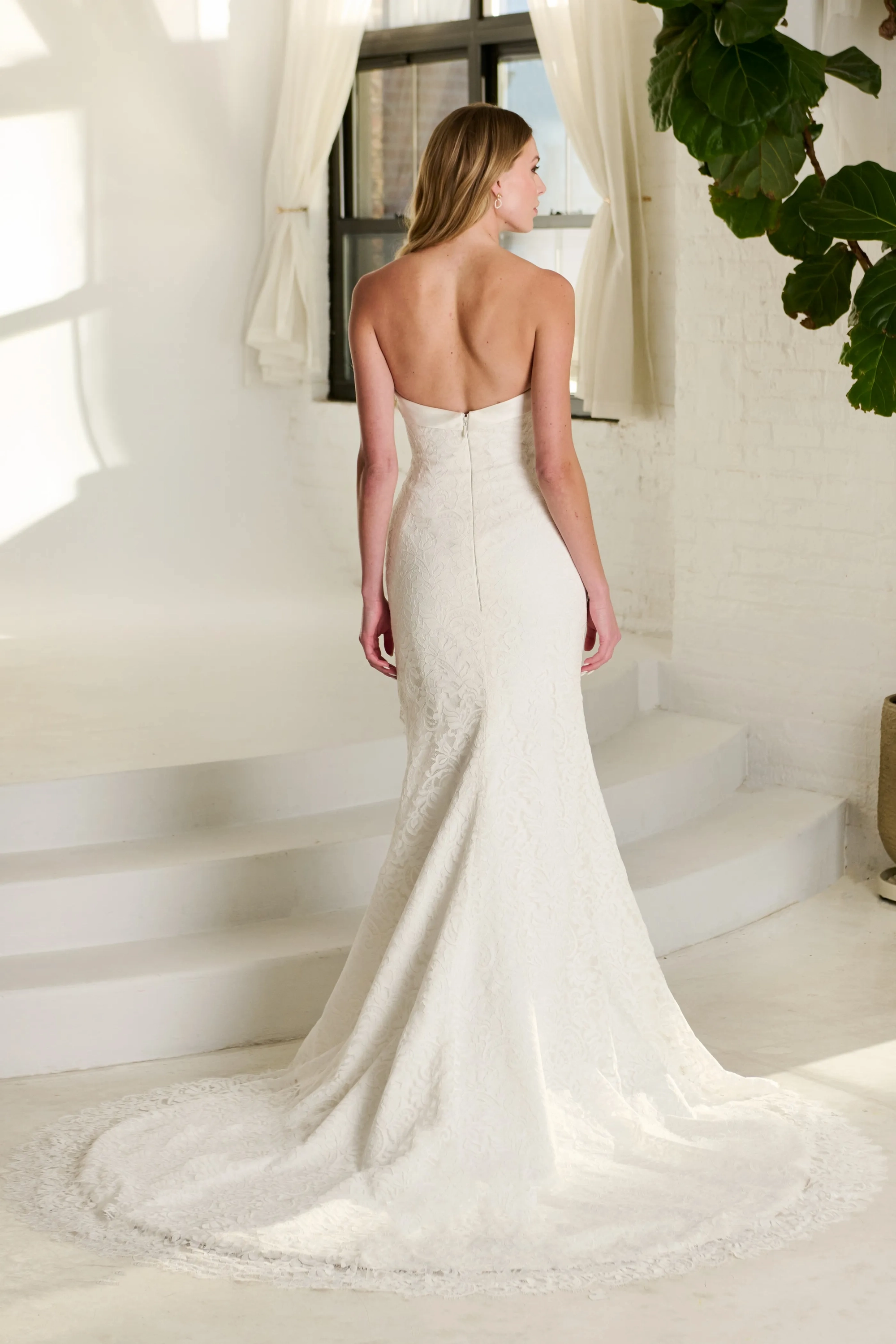 Strapless, all over lace, fit-to-flare gown with a crescent neckline and calcutta mikado band. It features a generous slit with scallop lace trim around the slit and along the hem.
