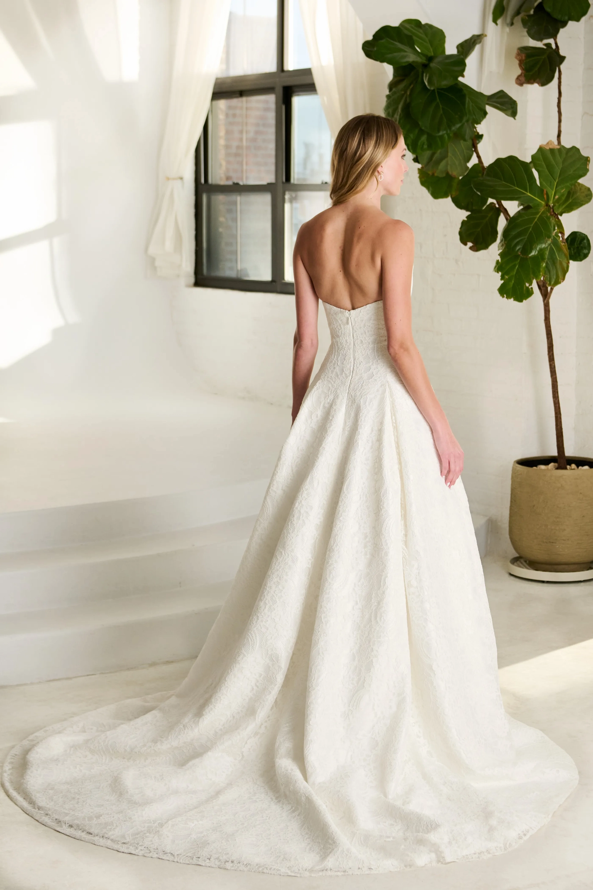 All-over lace ballgown with a scooped neckline. The gown features a dropped waist and dramatic box pleats.