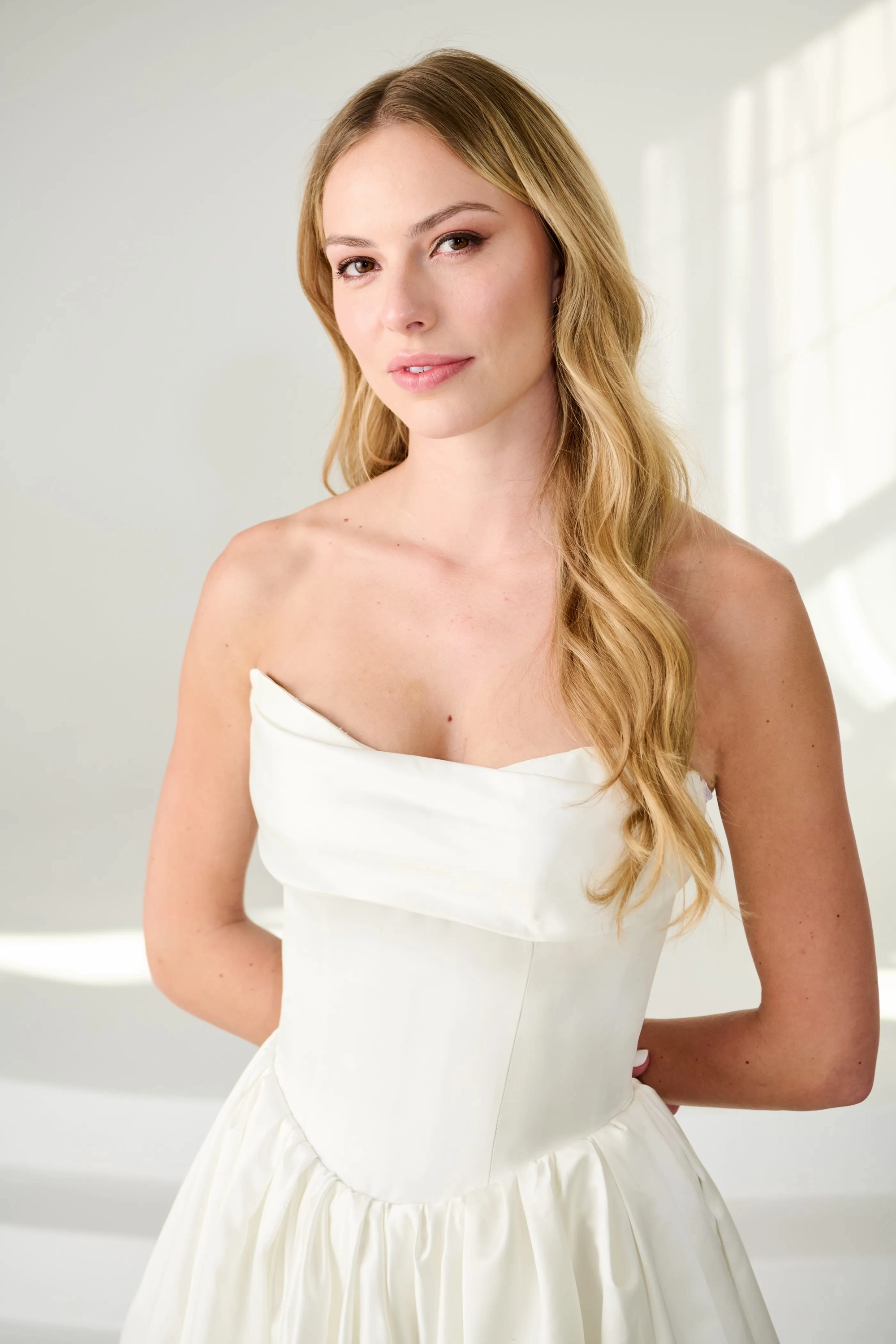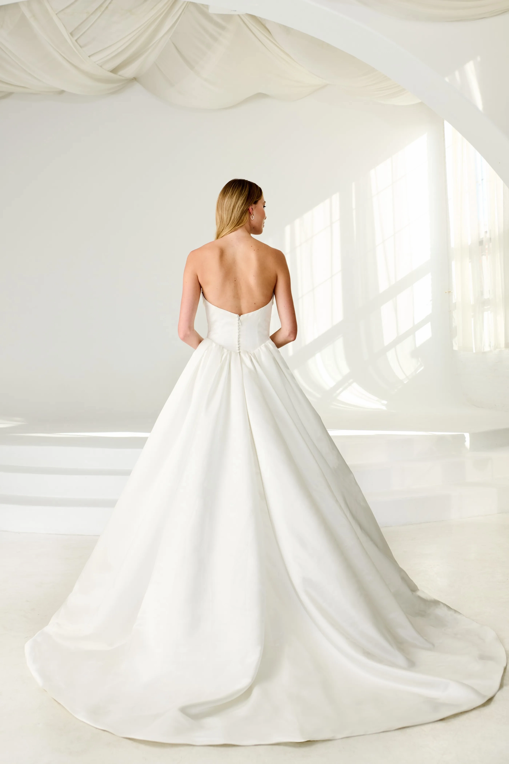 Non-stretch Satin ballgown with a scooped neckline and pleated detailing. It has a soft front and back basque waist with an organic gathered skirt. Buttons on the back bodice only.