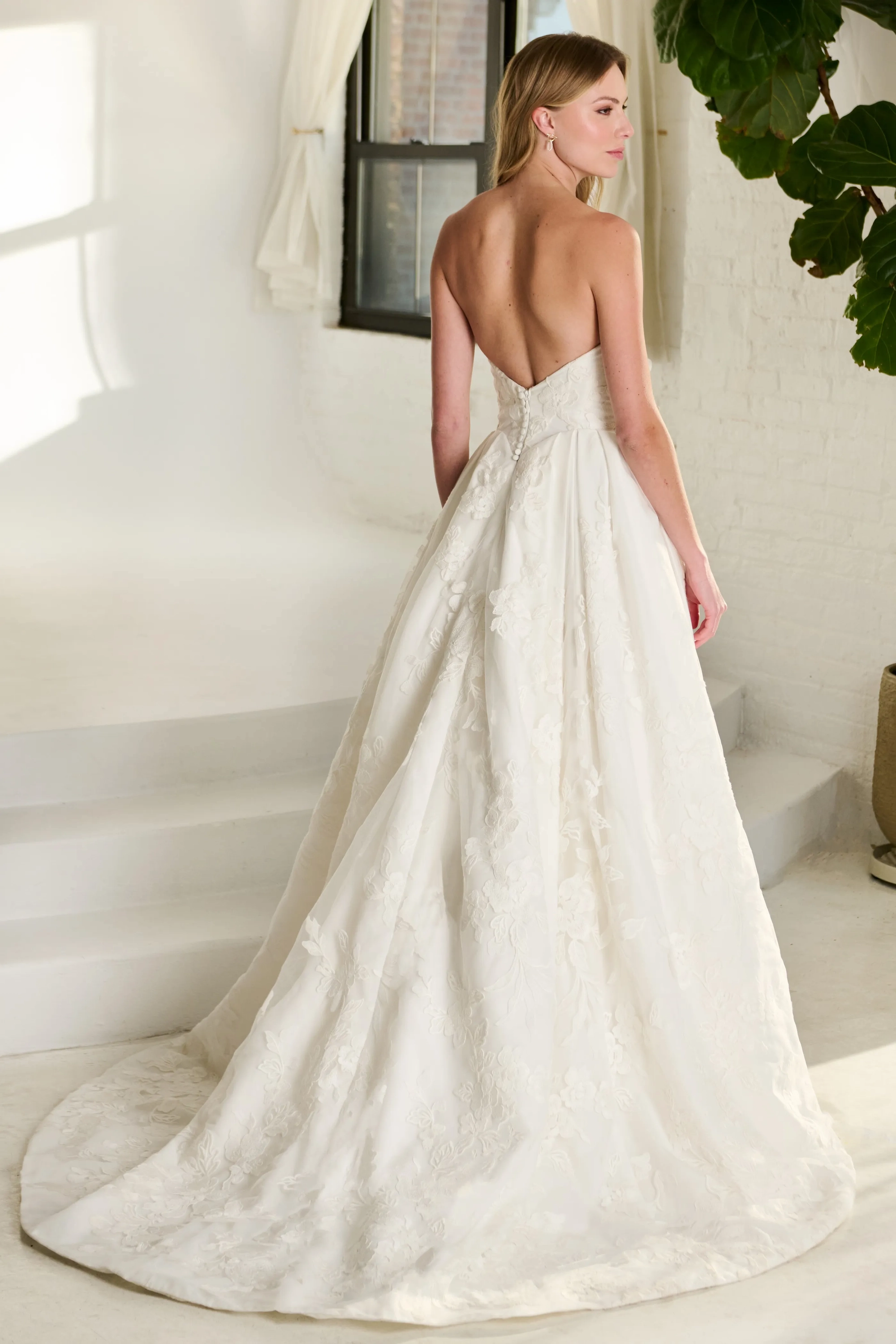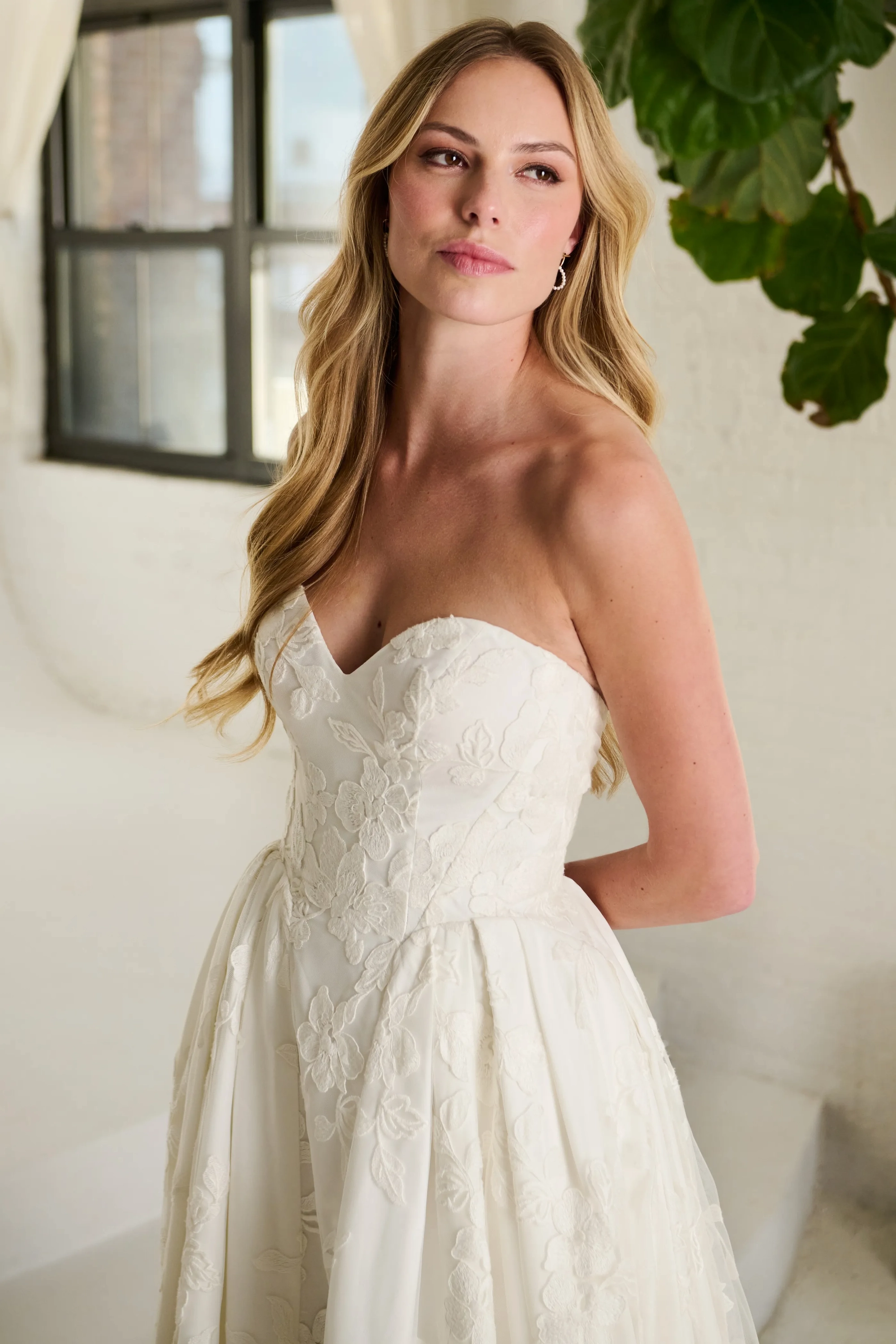 All-over lace ball gown with a cuffed sweetheart neckline. Full pleating on the hips of the skirt and smoothed out center front panel. Flattering arched waist seams.