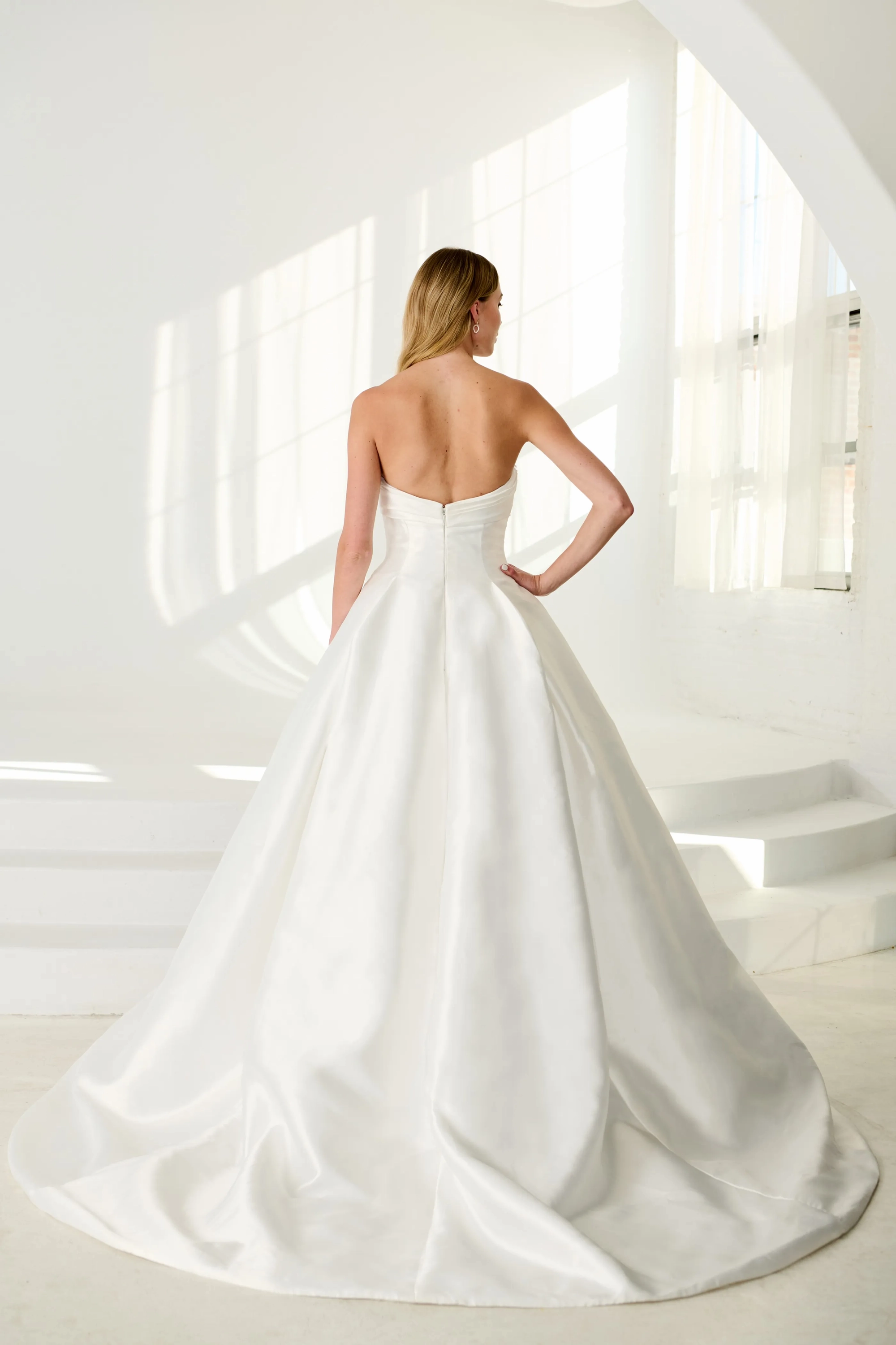 Mikado ballgown with a sweetheart neckline with a drop waist. This bodice has pleated detailing flowing into a box pleated skirt.