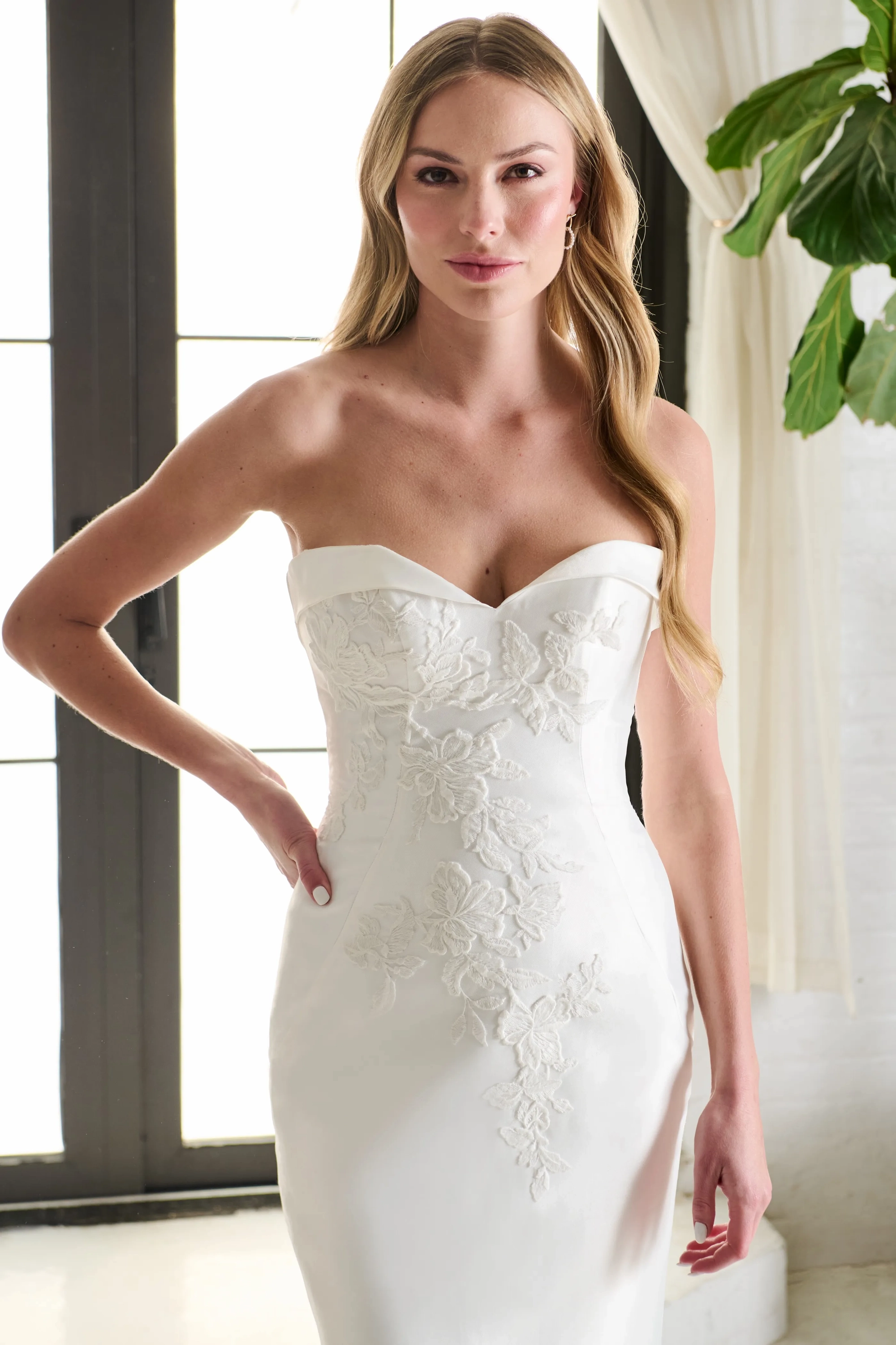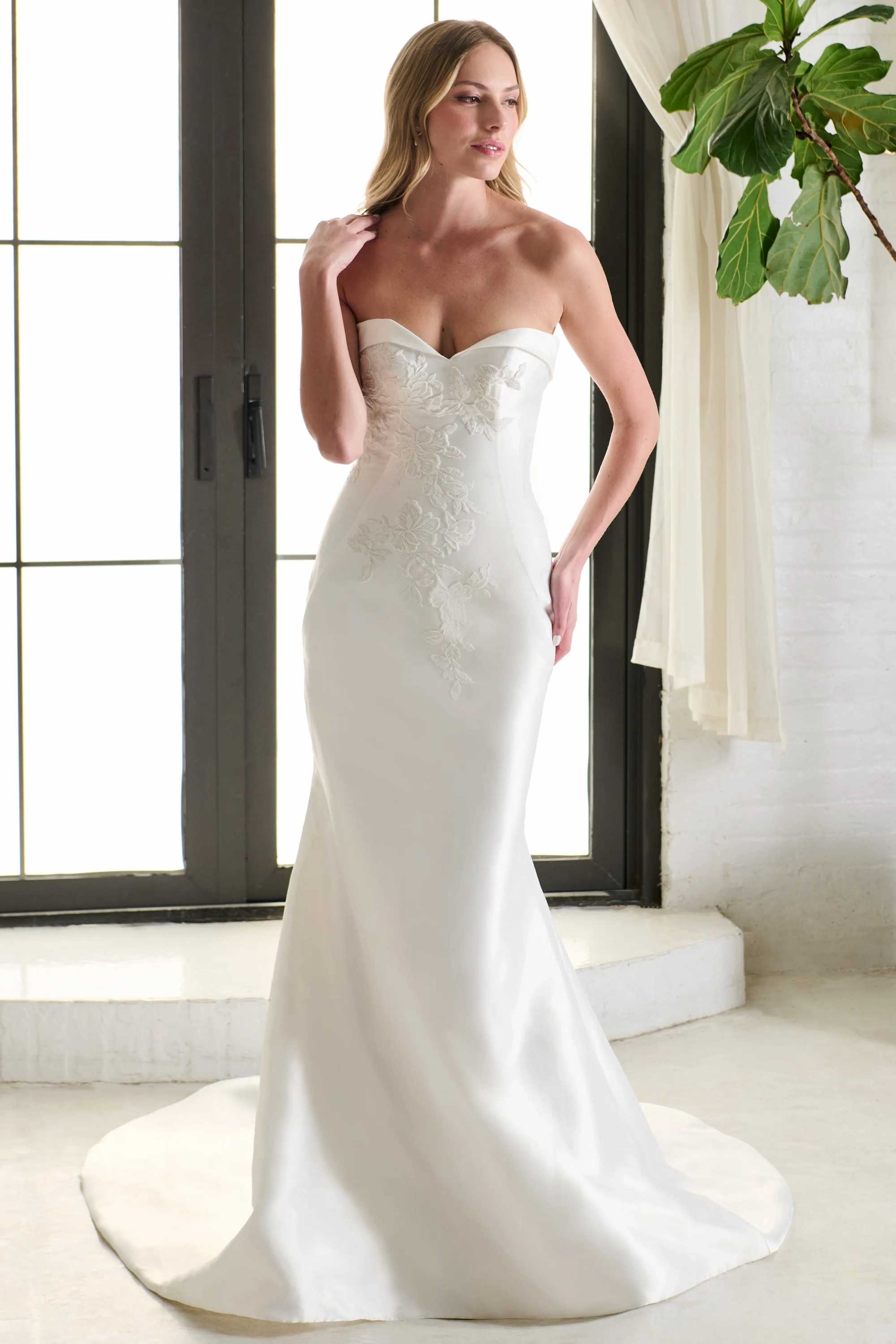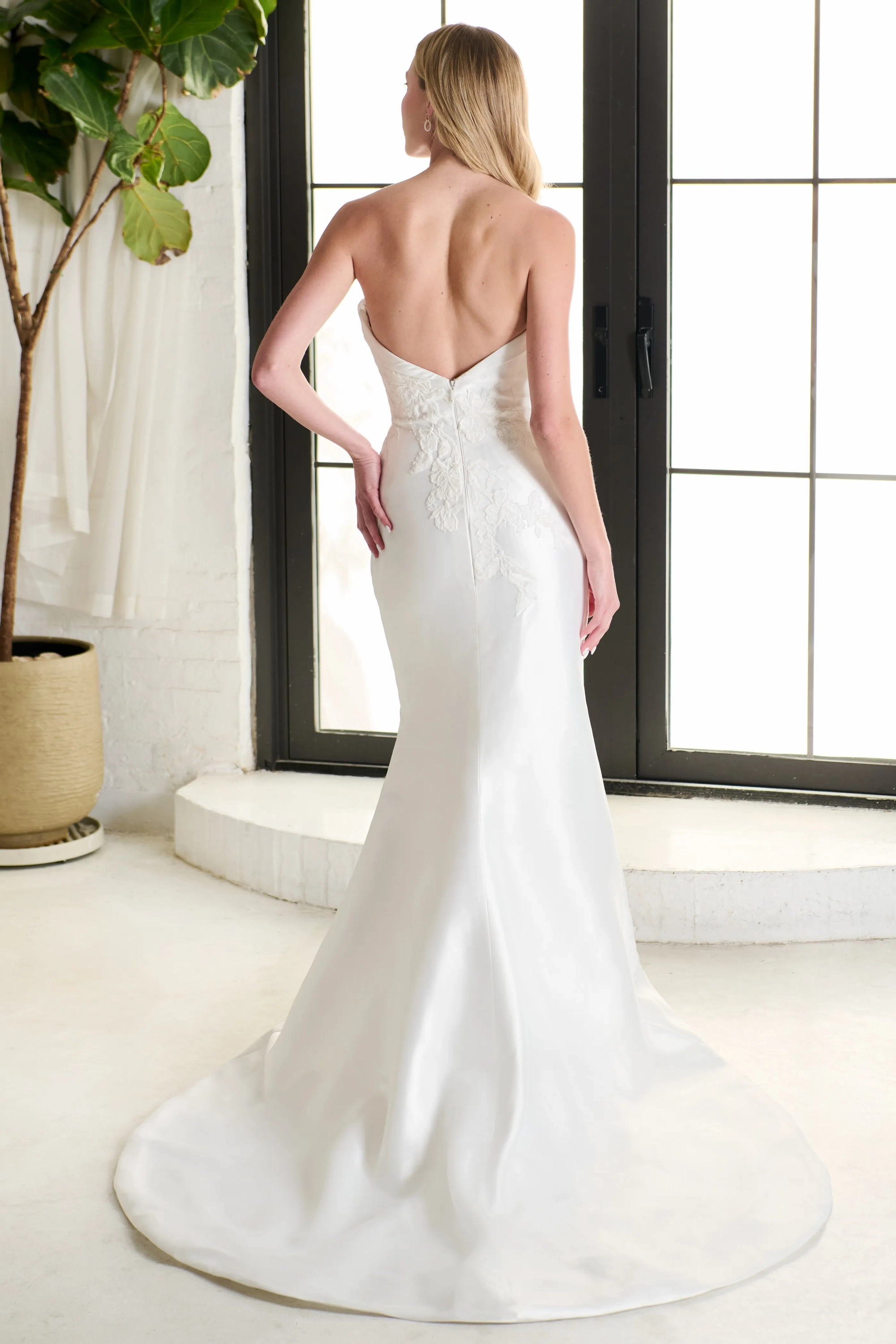 Fit-to-flare Calcutta Mikado gown with a cuffed sweetheart neckline. The gown features lace appliques along the front and back gown and contoured princess seamlines.